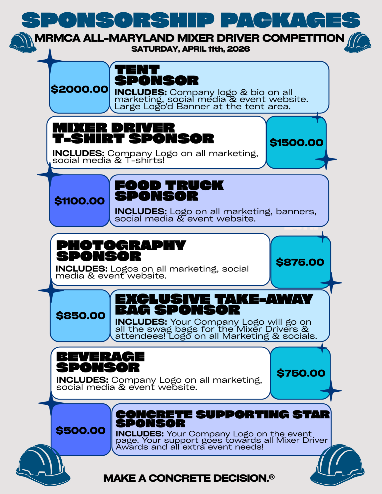 - All cancellation requests must go directly through Mindy Green at MRMCA: mindy@marylandconcrete.com at least 7 business days prior to the event or the Registrant will be liable for the entirety of the Registration fee.