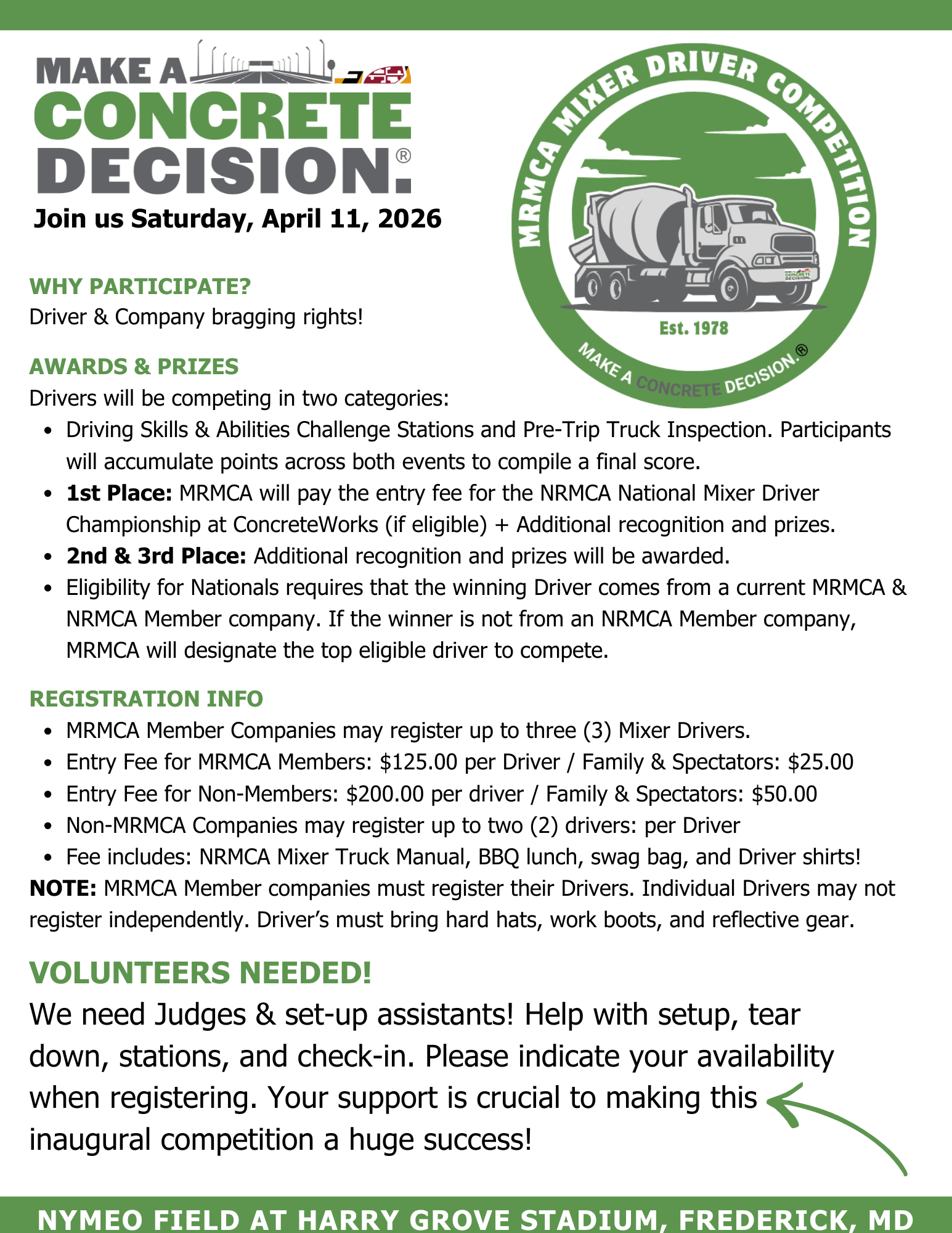 The Mixer Driver Competition will be located in the Front Parking Lot of Nymeo Field at Harry Grove Stadium. This is the parking lot across from the cemetery.